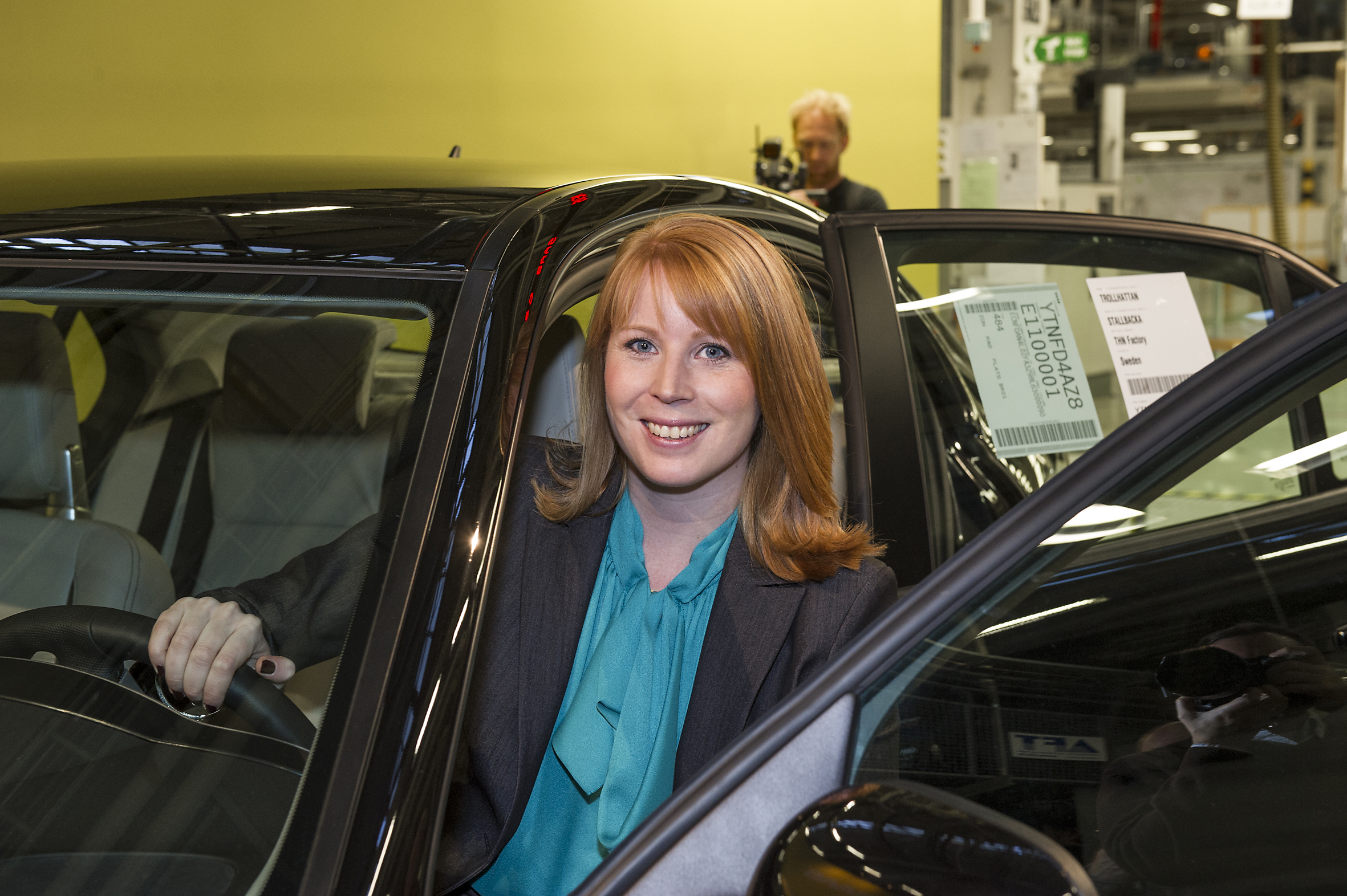 Svenska näringslivsministern Annie Lööf i den första Saab 9-3 Aero Sedan som gick av monteringslinan 2 december 2013 Foto: Nevs