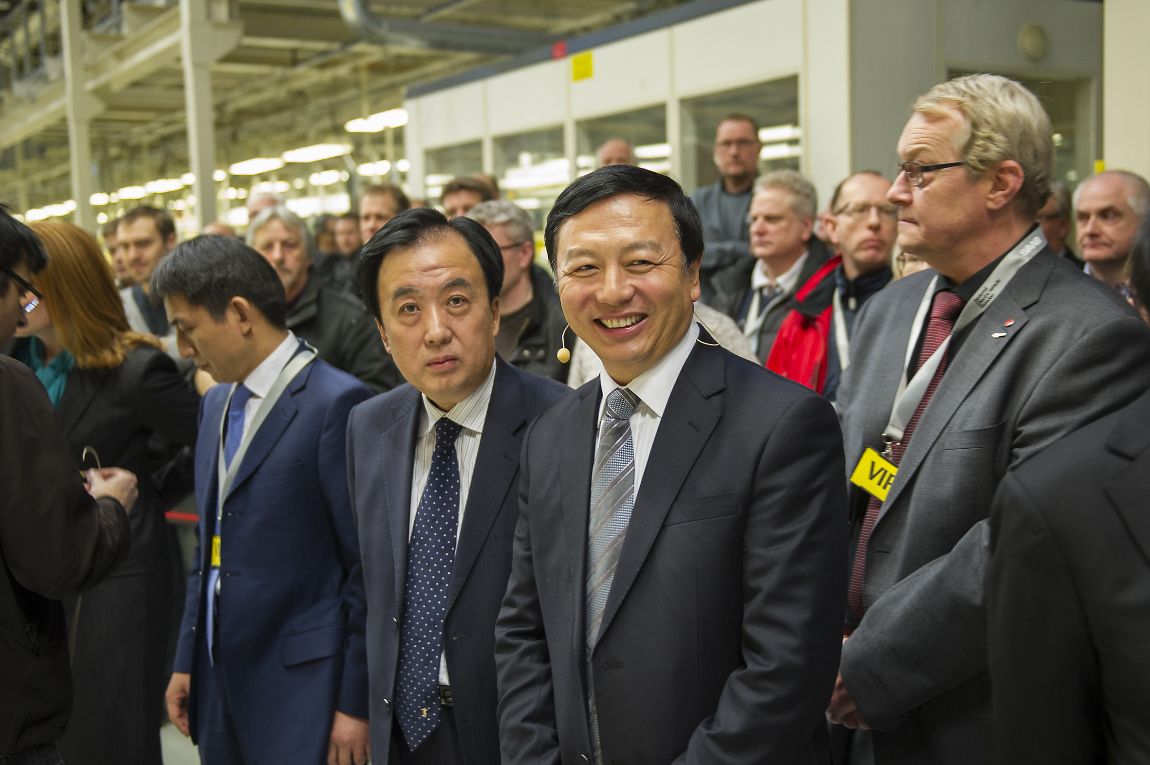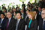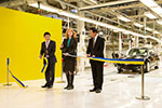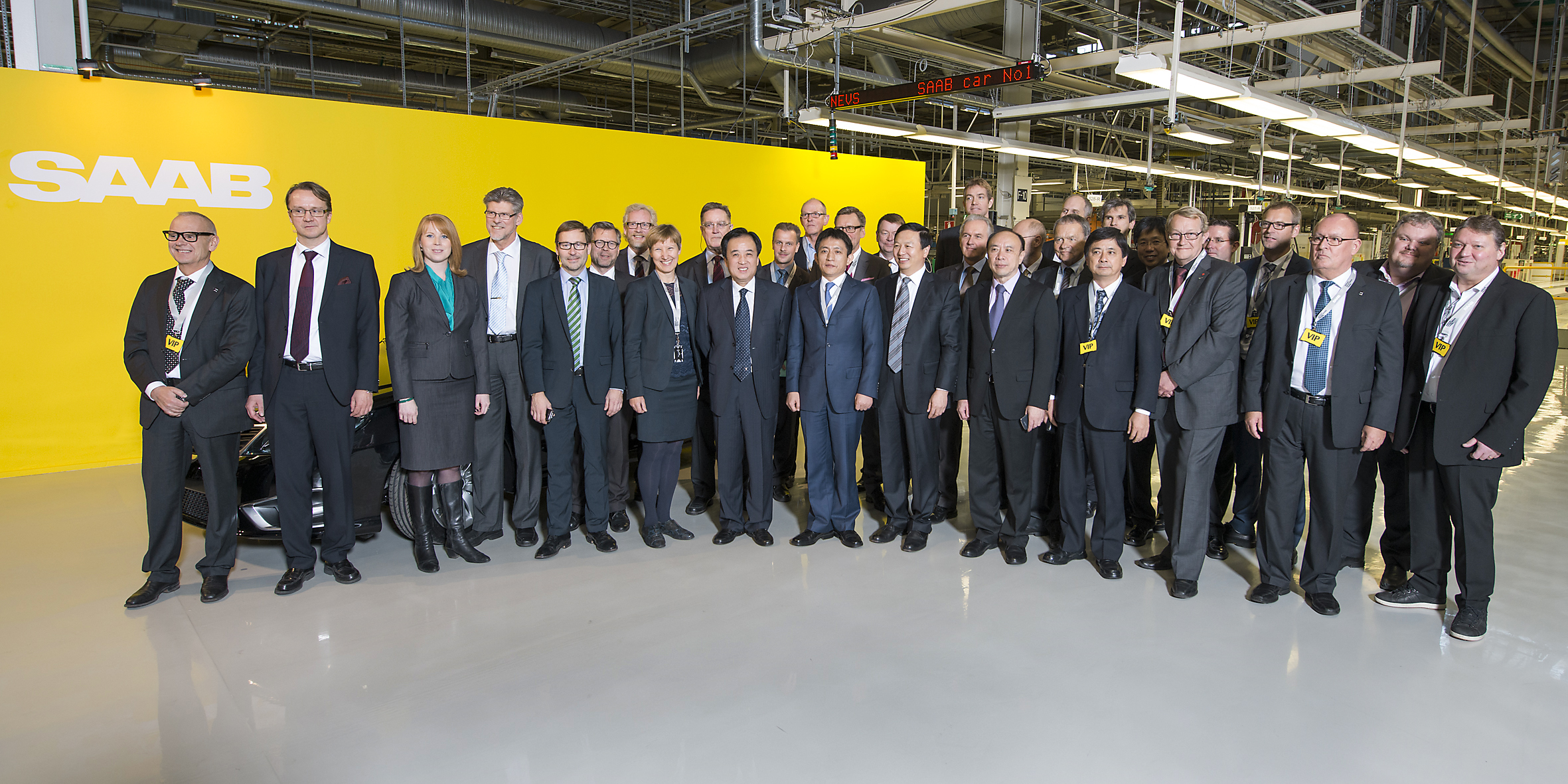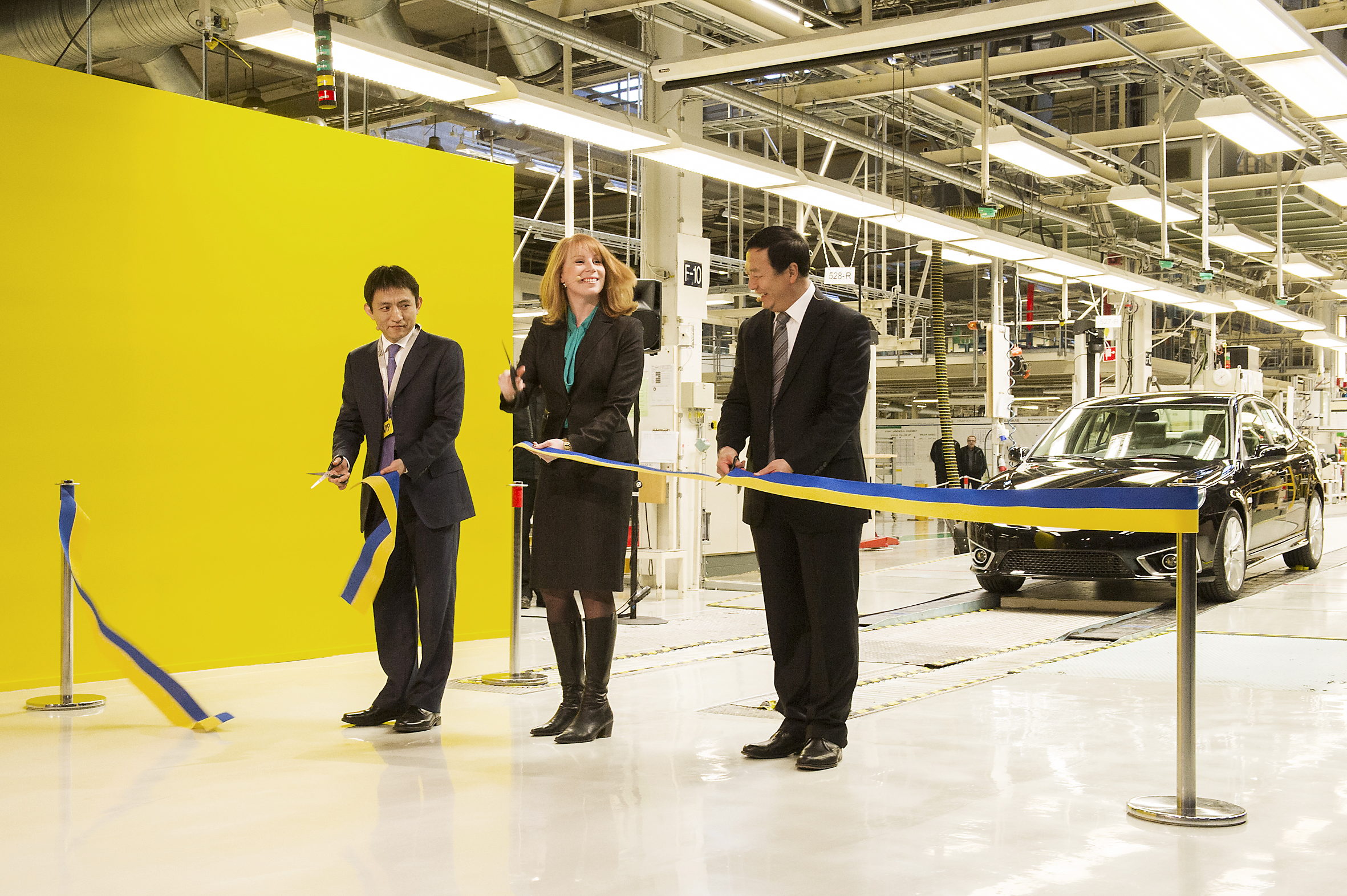 Vice Borgmästaren i Qingdao. Svenska näringslivsminister Annie Lööf och Nevs huvudägare Kai Johan Jiang klipper bandet för produktionsstarten av Saab 9-3 Aero Sedan Foto: Nevs